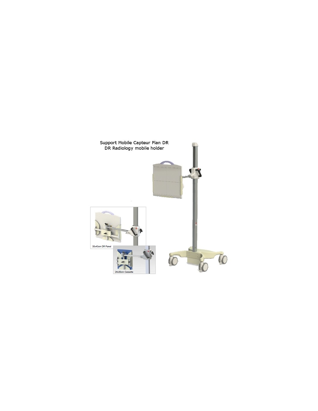 These versatile holder can be used with portable DR panels, CR, DR and film cassettes / grids from 24x30cm to 35x43cm and up to 3cm thick.
